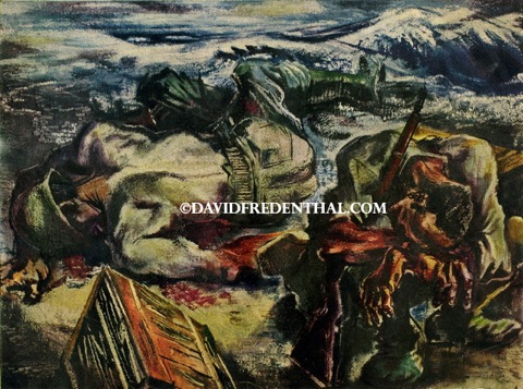 A Wounded Man, grievously hit during the beach strafing, is carried to an aid